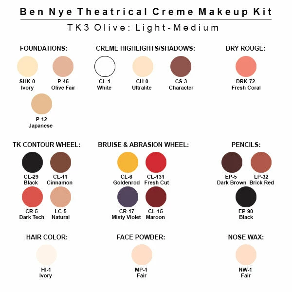 Each Ben Nye Theatrical Creme Makeup Kit includes 5 cream bases, with 3 of those as foundation shades based on the kit you choose.