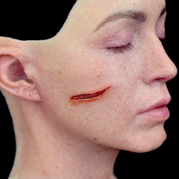 The peel-and-stick silicon prosthetic appliance goes on like a Band-Aid, then all you have to do is blend the edges. With the attached adhesive, it couldn’t be easier. There is nothing to mix, no fumed silicates to avoid inhaling.