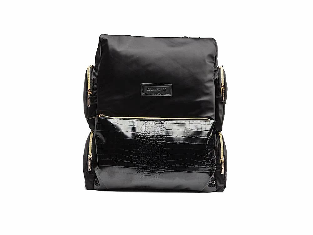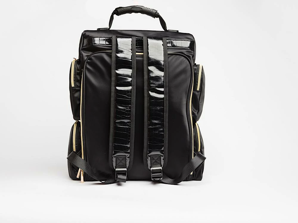 This gorgeous bag is draped in nylon and crocodile embossed vegan pu leather, with a large front exterior carry-all pocket. The backpack is enveloped by 4 additional carry-all compartments on the side for additional space and storage. Two cushioned and lined straps support this unit while a crossbody strap make shoulder carry possible, with ease.